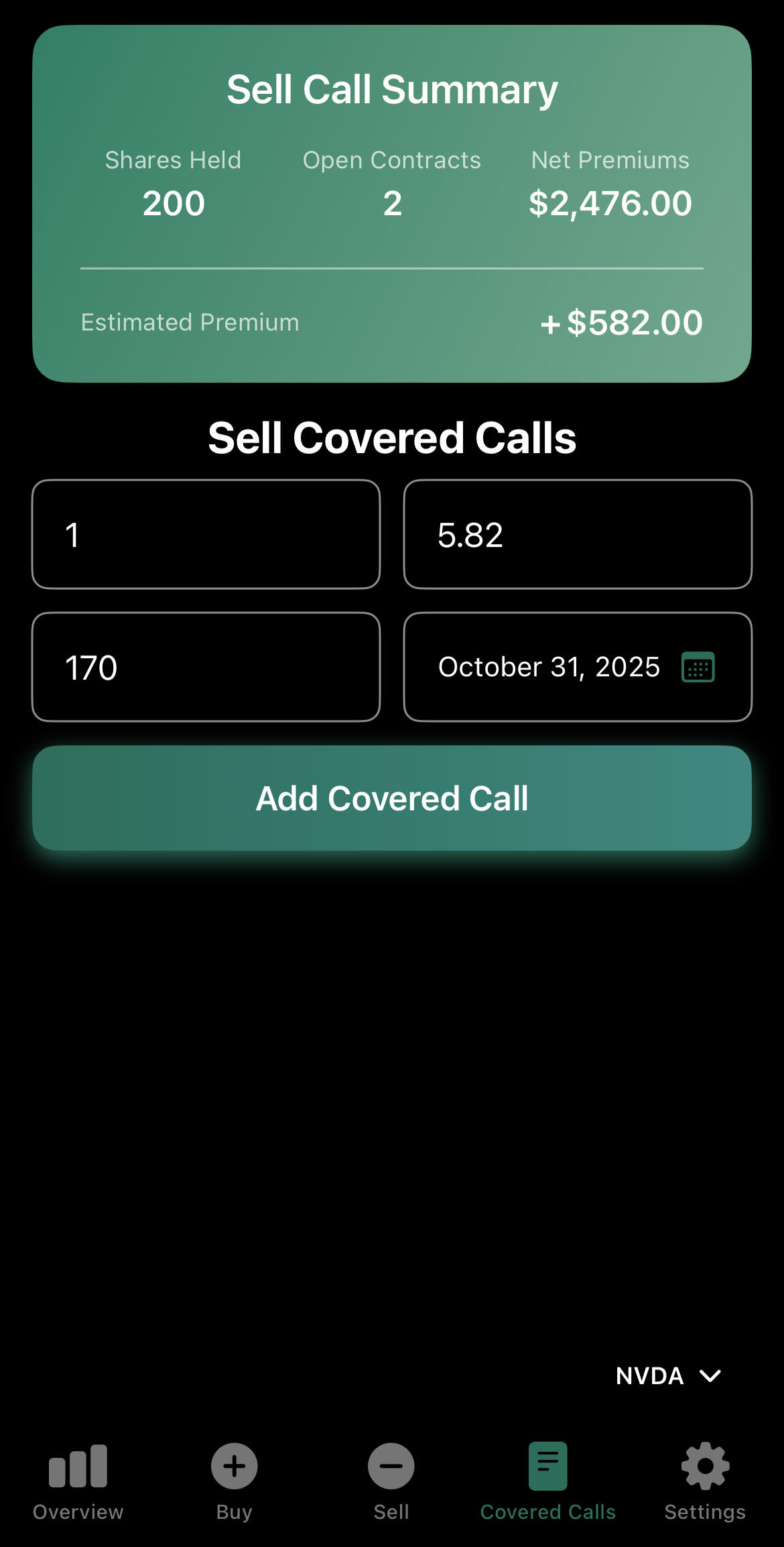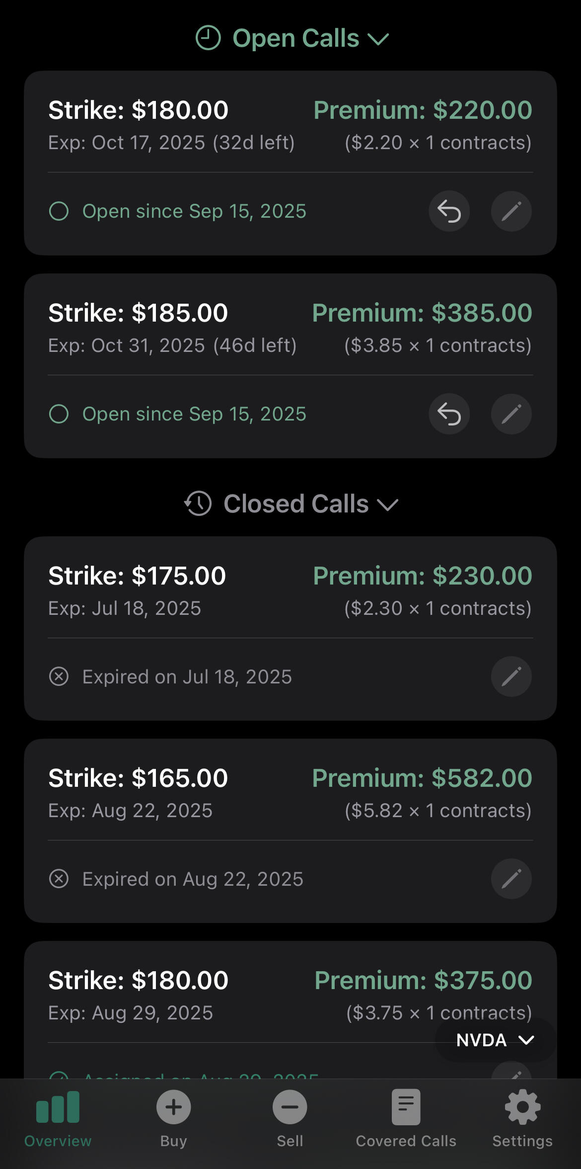 | ✅ Add, edit, delete covered calls | ✨ Real-time alerts — expirations, overdue calls |