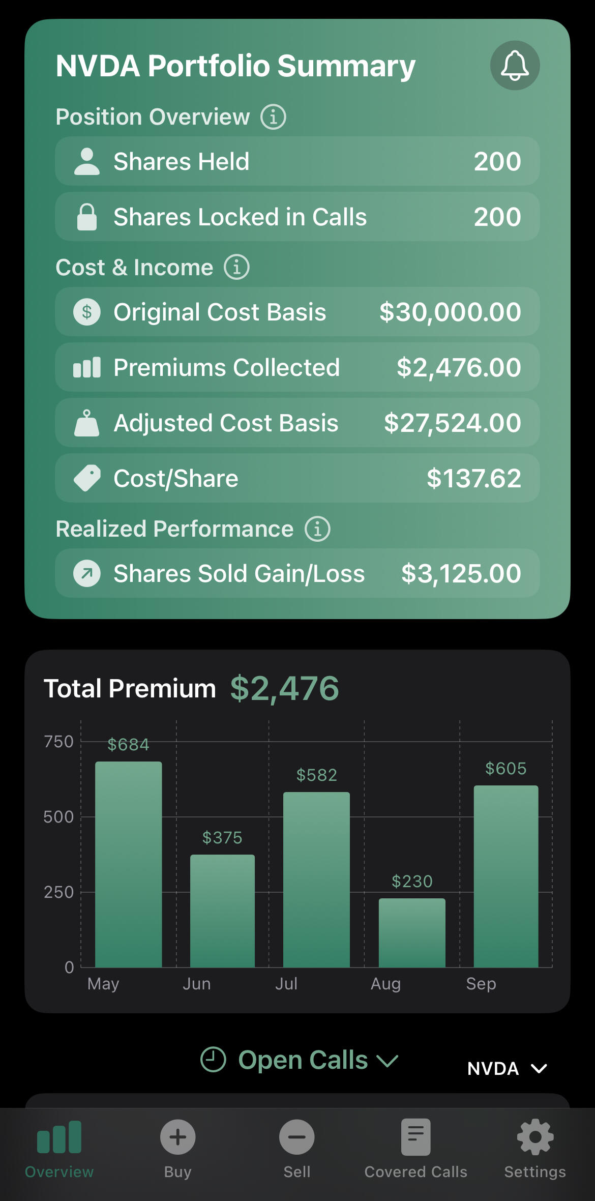 View adjusted cost, premiums, gain/loss, and key performance stats at a glance